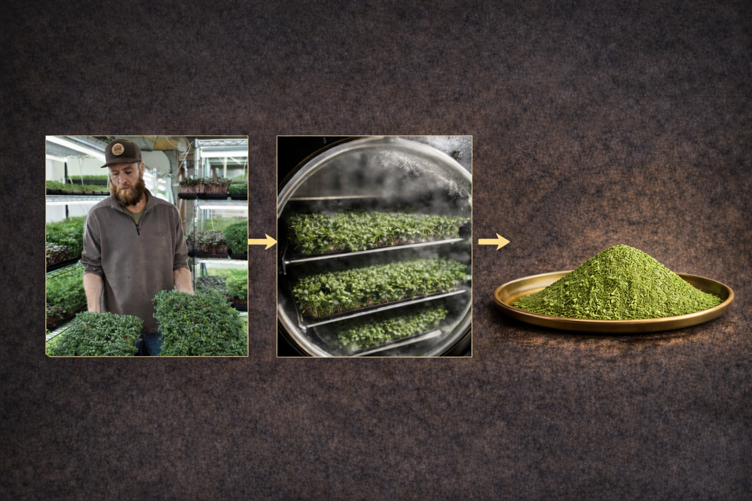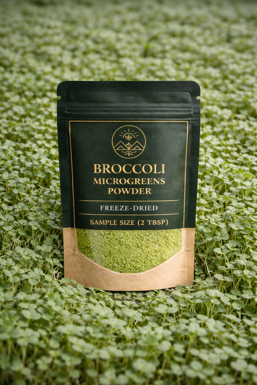 Freeze-dried broccoli microgreens grown in the heart of Central Oregon — consciously cultivated, harvested, and preserved to bring your body the purest, most nutrient-dense nourishment nature can offer.